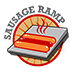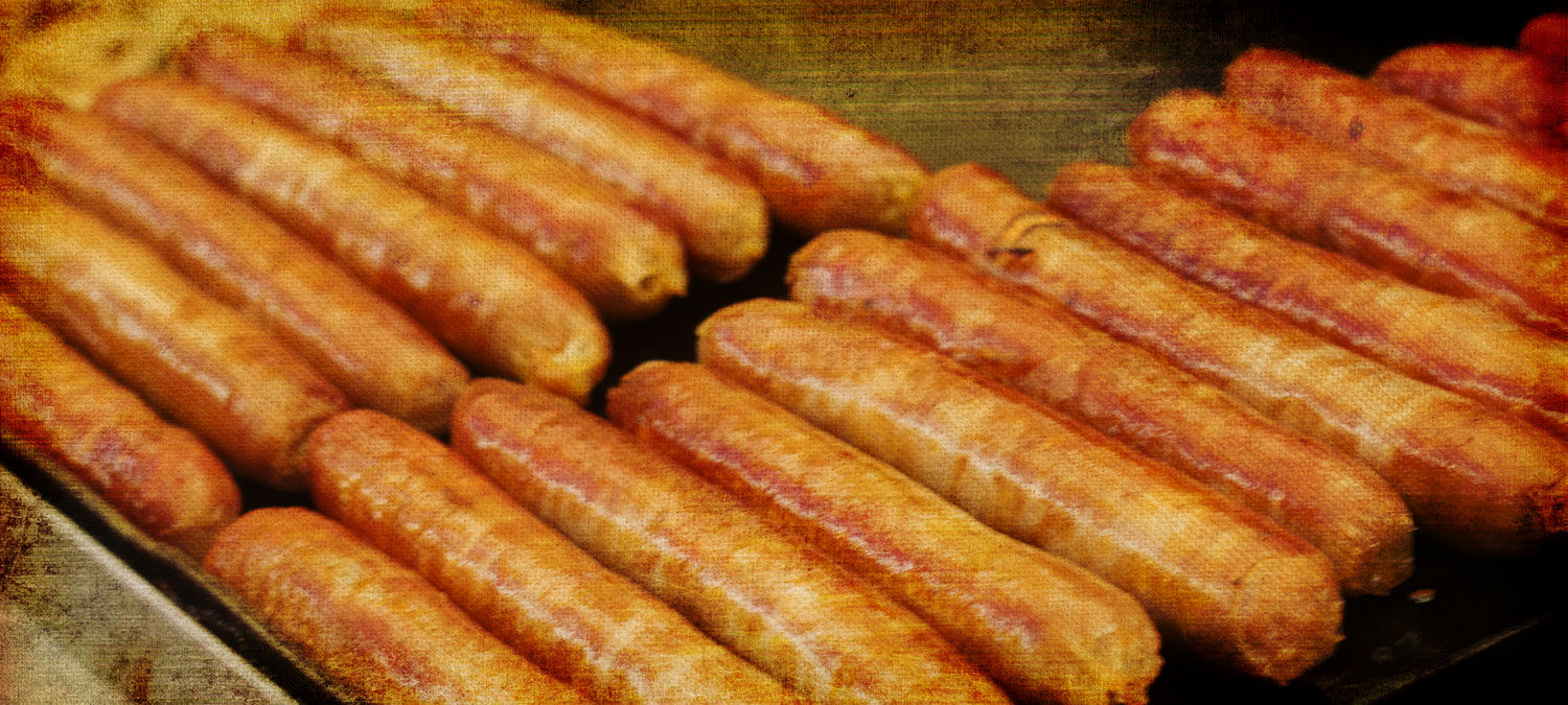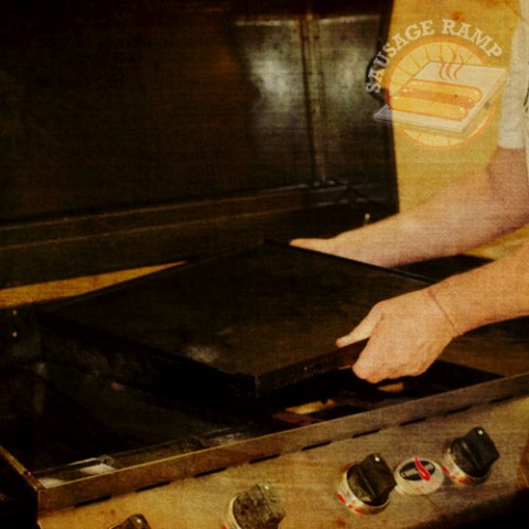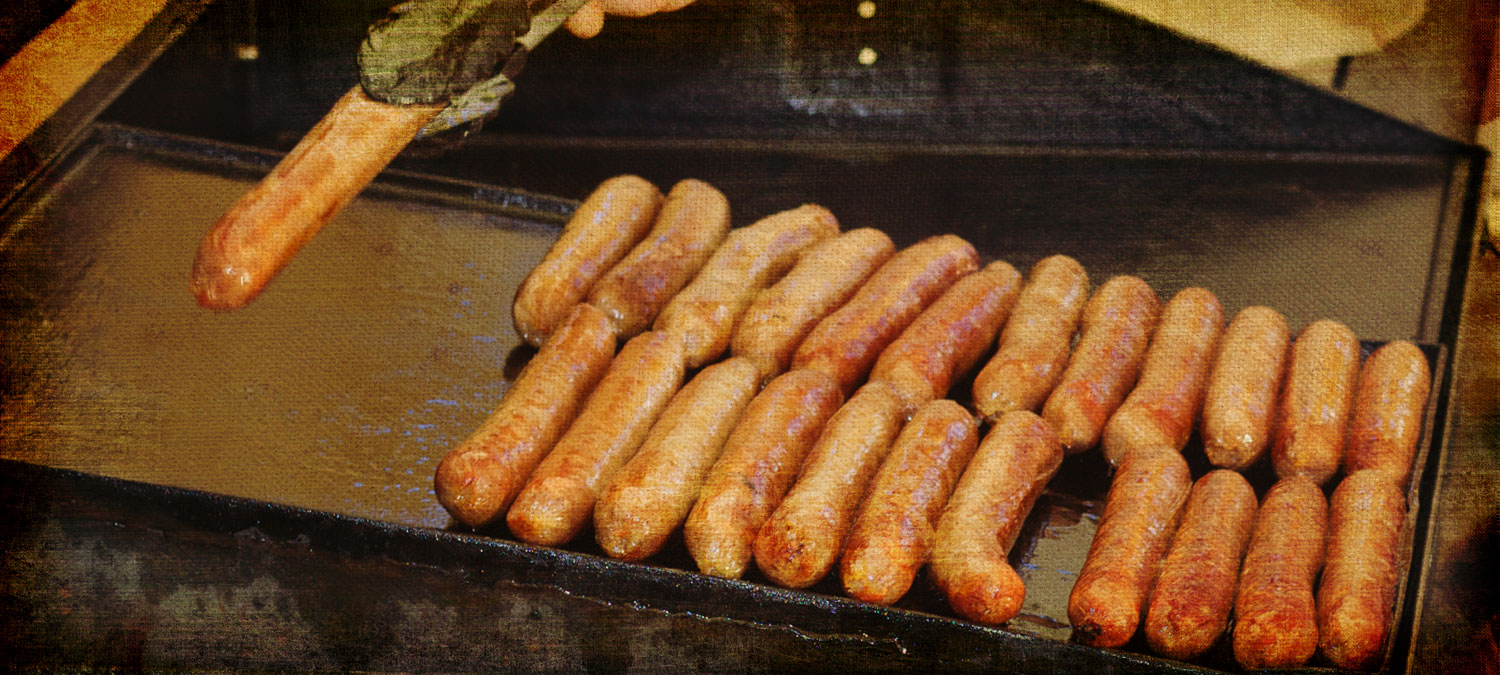 Sausages roll in unison as they get cooked evenly on the steel ramp